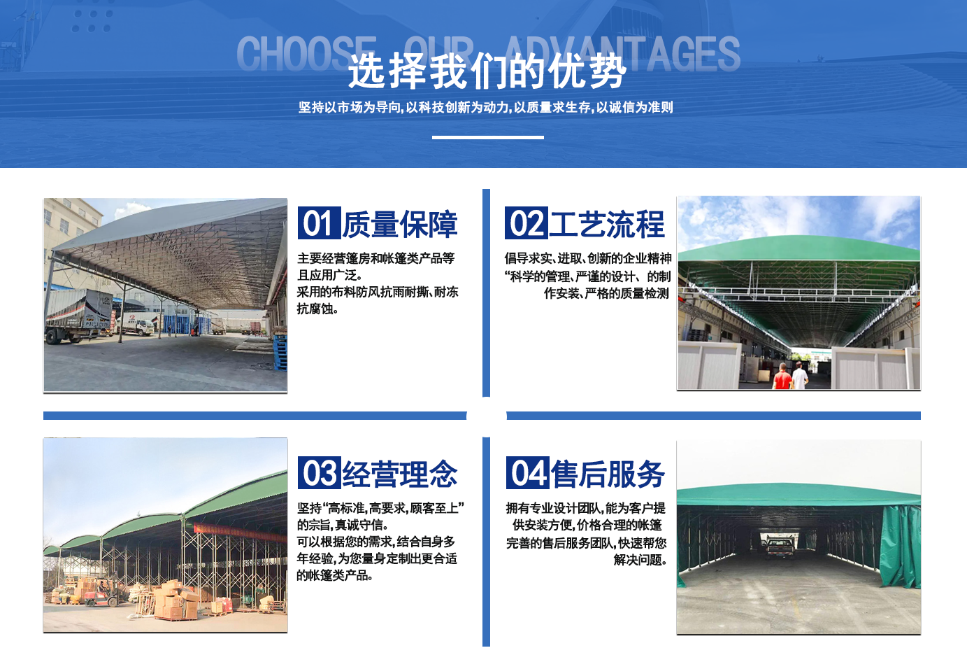 遼寧拓圖鋼結構工程有限公司是一家專業從事推拉篷設計、制作、安裝、使用、維修的綜合性公司。公司主營:電動雨棚、活動雨棚、倉庫雨棚、體育類雨棚、篷房、篷布、帳篷等系列產品的制作與安裝。    遼寧拓圖鋼結構工程有限公司堅持以市場為導向,以科技創新為動力,以質量求生存,以誠信為準則,倡導求實、進取、創新的企業精神。“科學的管理、嚴謹的設計、 的制作安裝、嚴格的質量檢測、良好的后期服務成就企業的信譽,為您提供優質服務。    遼寧拓圖鋼結構工程有限公司傾力于開發應用三維空間結構與新材料的結合,將廣告藝術視覺表現形式與張力膜材科學的結合,推出多彩推拉蓬,依靠先進的科學技術,將推拉蓬建筑表現形式無限延伸,立志走在建筑科學的前沿,引導建筑時尚潮流,我們的目標是使推拉蓬建筑在中國發展壯大。    遼寧拓圖鋼結構工程有限公司憑著極強的事業熱情和豐富的專業經驗以“勤勉進取、銳意創新、至誠至信”的精神使公司得到迅速健康發展,業務范圍遍及全國。科學的管理、嚴謹的設計、高標準的制作安裝流程,嚴格把控產品質量,熱誠的售后服務是企業競爭力的源泉。    遼寧拓圖鋼結構工程有限公司人愿以最誠摯的態度,歡迎廣大客戶的蒞臨與溝通!愿為市場提供優...